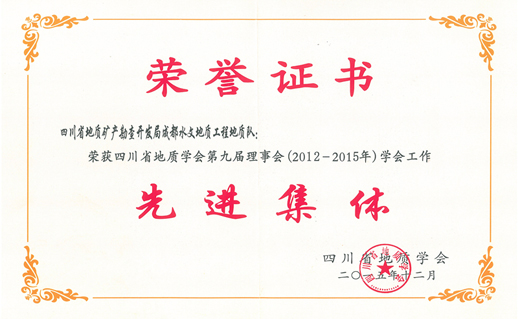 我隊榮獲第九屆四川省地質(zhì)學(xué)會先進集體榮譽稱號