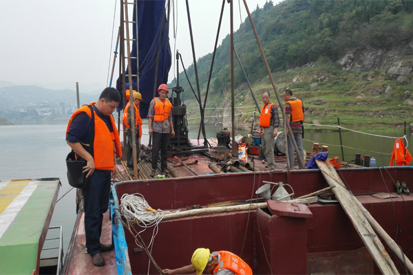 近日,水文地質(zhì)工程公司承擔(dān)的萬(wàn)州-云陽(yáng)天然氣供氣管道工程彭溪河隧道穿越勘察任務(wù)已順利完成所有野外工作。水文地質(zhì)工程公司首次在水深40米的河面上完成了水上深孔的鉆探施工,積累了豐富的經(jīng)驗(yàn)。