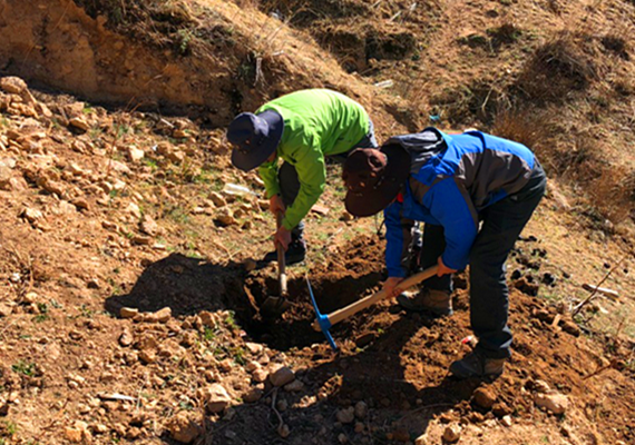 由于卡洛村郎機(jī)嶺溝泥石流勘查設(shè)計項目地處藏區(qū),語言不通等因素,項目組人員便自行購置鋤頭、鐵鍬等工具,開展槽探和采集樣品工作。頂著高原的烈日,在海拔近4000m的斜坡開展詳細(xì)地質(zhì)調(diào)繪和地形圖測量工作,方便米飯和涼水便解決了一日三餐,但項目組人員沒一人喊苦叫累。終于,經(jīng)過兩天的辛苦工作,項目組順利完成了郎機(jī)嶺溝泥石流勘查設(shè)計項目野外工作。
