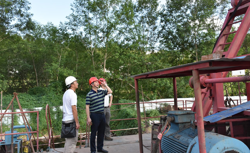 在白衣鎮(zhèn)地下熱礦水鉆探施工項(xiàng)目現(xiàn)場,項(xiàng)目負(fù)責(zé)人劉文勝向廖書記一行詳細(xì)介紹溫泉鉆探施工的進(jìn)展情況。