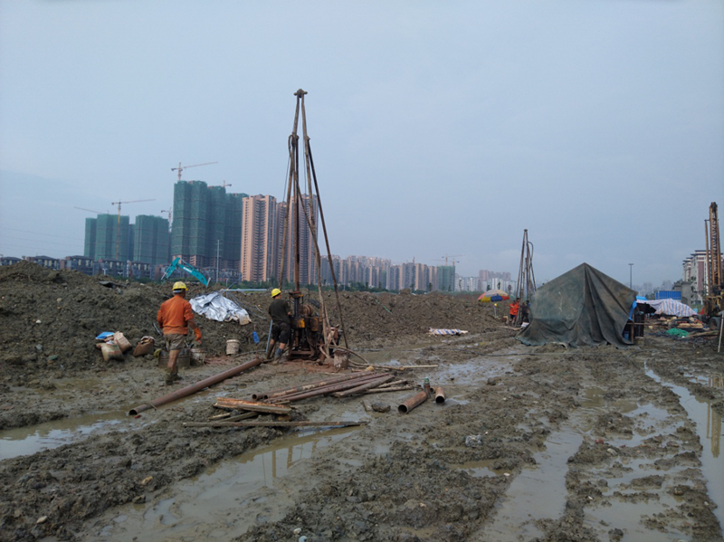 該項目巖土工程勘察原計劃工期為20個日歷天,勘探鉆孔782個、鉆探工作量17118米。開工初期,雖然調(diào)集了30臺鉆機進場,但要滿足建設(shè)單位的工期要求,仍存在很大差距,加之連續(xù)下雨導(dǎo)致場地積水嚴重且泥濘不堪,勘探進度十分緩慢,我院水文地質(zhì)工程公司迅速組織安排專人聯(lián)系成都、重慶、成都周邊地區(qū)的數(shù)十支鉆探隊伍,鉆機增至50臺。