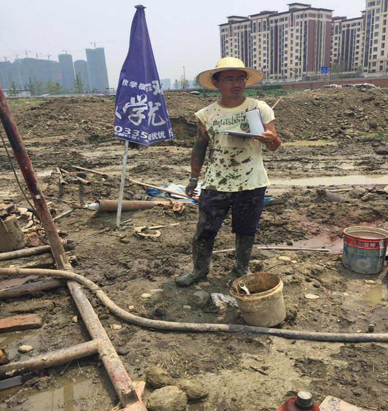 在泥濘場地中安排鉆探生產(chǎn)的項目負責(zé)人范偉 勘察項目現(xiàn)場實測溫度約46度