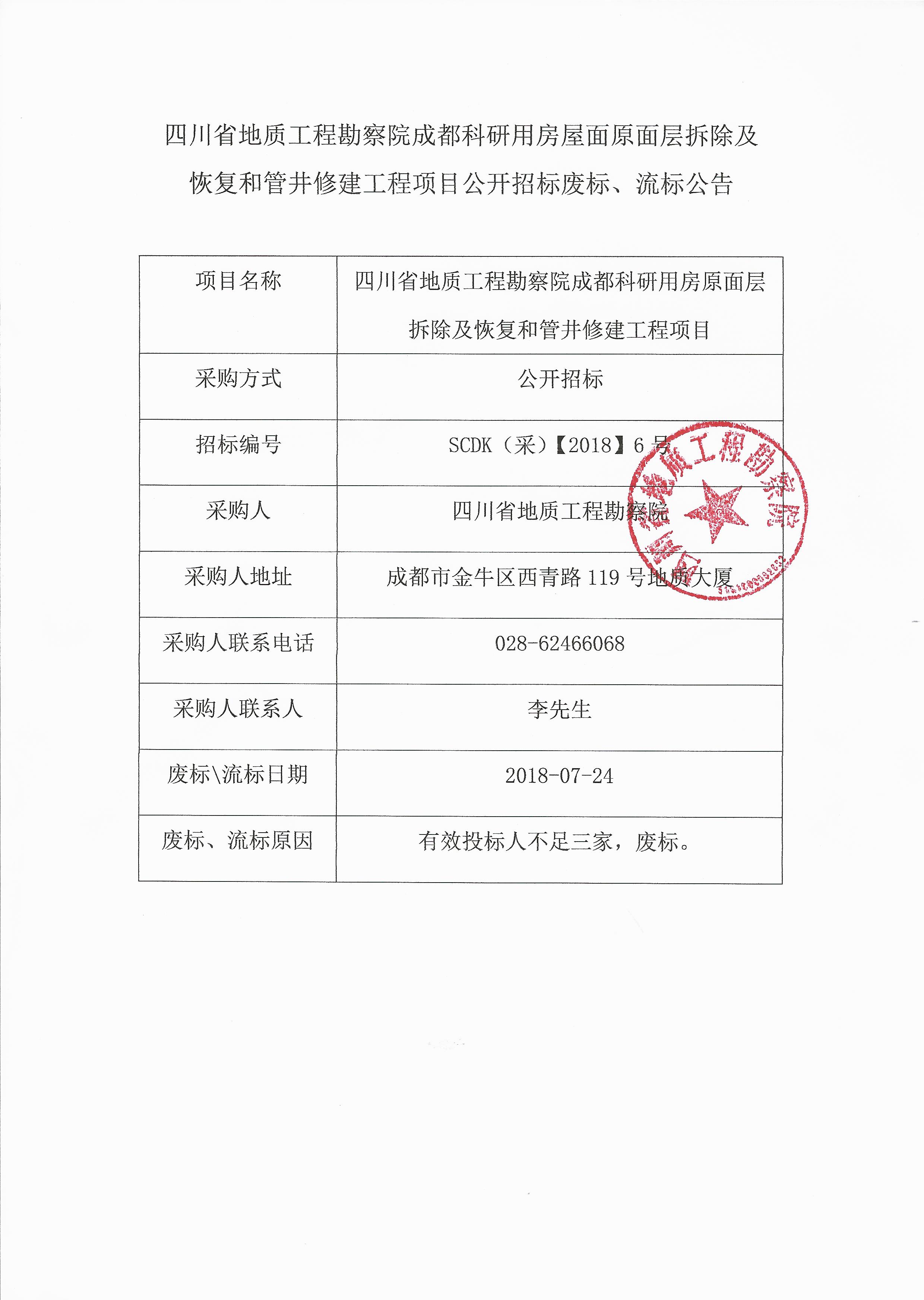 四川省地質(zhì)工程勘察院成都科研用房屋面原面層拆除及恢復(fù)和管井修建工程項(xiàng)目公開招標(biāo)廢標(biāo)、流標(biāo)公告