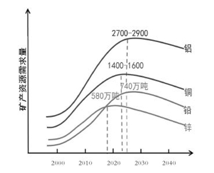 王安建教授預(yù)測,達(dá)到峰值的礦產(chǎn)需求總量會很高。預(yù)計(jì)鋼鐵消費(fèi)的峰值大致是在7億噸~7.5億噸;能源消費(fèi)的峰值大約出現(xiàn)在2030年,大約消費(fèi)40億~42億噸;我國銅的消費(fèi)峰值大致在2022年~2025年,大約消費(fèi)1300萬噸~1500萬噸;鋁的消費(fèi)峰值大致在2022年~2025年, 消費(fèi)2700萬噸~2900萬噸;鉛、鋅的消費(fèi)峰值大致在2022年左右,鉛大約消費(fèi)680萬噸~700萬噸,鋅大約消費(fèi)770萬噸~790萬噸。